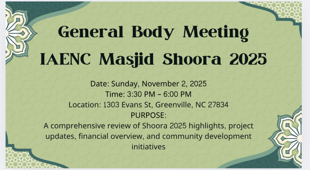 The Islamic Association of Eastern North Carolina was established in 1985. Since that time the Islamic Center facility has doubled. With the growing needs of the Muslim community, plans for even bigger expansion in future are under active consideration.